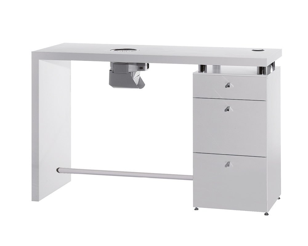 Grande table de manucure en stratifié blanc caractérisée par un plateau épais de forme carrée et des trous de câbles. Les deux armoires latérales sont équipées d'un petit tiroir et de deux grands tiroirs, elles sont reliées au plan de travail par des colonnes chromées. En haut, en position centrale, l'aspirateur est monté. Logic est également disponible dans la version avec armoire simple latérale (MB / MT005 / B).